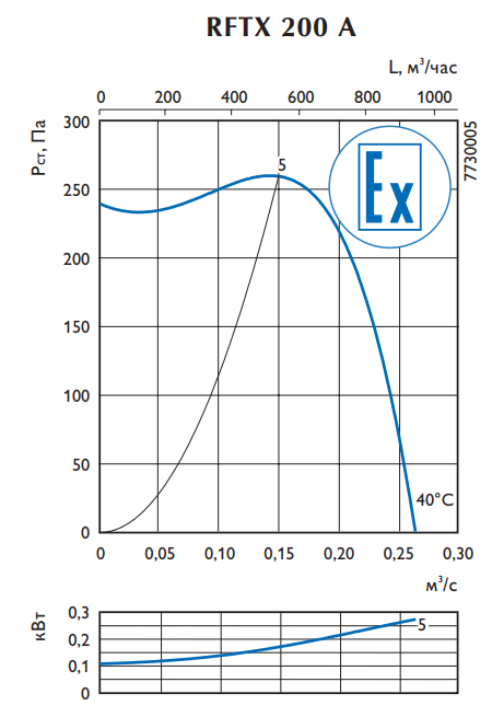 Центробежный взрывозащищенный вентилятор типа RFТХ оборудован вынесенным взрывозащищенным асинхронным двигателем с короткозамкнутым ротором и уплотненными подшипниками, что увеличивает срок их службы. Корпус вентилятора изготовлен из оцинкованной стали. Рабочее колесо вентилятора изготовлено из того же материала, что и корпус и проходит статическую и динамическую балансировку. Вентиляторы имеют загнутые вперед лопатки и выпускаются с односторонним всасыванием. Для обеспечения требования взрывозащищенности входной диффузор вентилятора выполнен искробезопасным и изготовлен из меди. Двигатель с рабочим колесом и корпусом вентилятора установлен на кронштейне, который позволяет быстро и просто закрепить вентилятор на стене, потолке или другом основании. Взрывозащищенные вентиляторы изготовлены в соответствии с требованиями ГОСТ 52350.0-2005, ГОСТ 52350.14-2006 и обеспечивают повышенный уровень безопасности в соответствии с требованиями 2ExeIIТ3 Х.