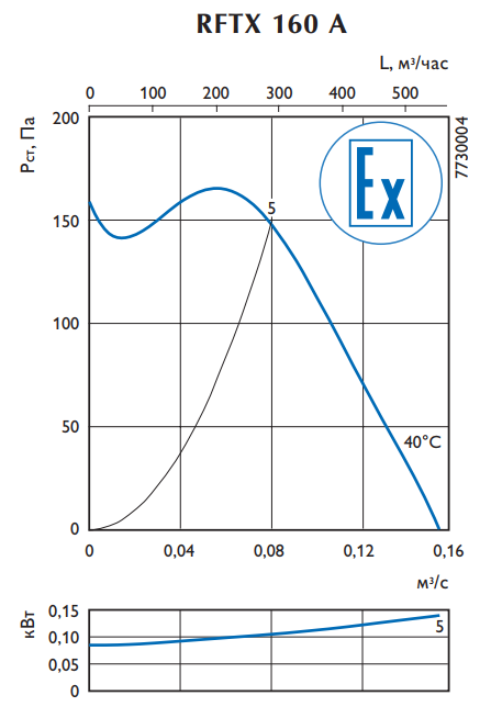 Условия работы RFTX 160 A: - не должен эксплуатироваться во взрывоопасных помещениях, недопустимо соединение с дымоходами. - не допускается использовать для перемещения взрывчатых газов, пыли, сажи, муки и т.п. - предназначен для непрерывной работы. Не рекомендуется производить частое включение и выключение вентиляторов. Технические характеристики: Тип вентилятора - Ostberg RFTX160A (7730004) Максимальная температура - 40 °C Производ. по воздуху - 575 м3/ч Частота вращения - 1300 об/мин Ном. мощнасть - 143 Вт Напряжение - 400 В Ток - 0,53 А