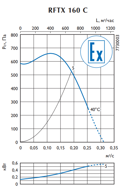 Технические характеристики: Тип вентилятора - Ostberg RFTX160C (7730003) Максимальная температура - 40 °C Производ. по воздуху - 930 м3/ч Частота вращения - 2740 об/мин Ном. мощнасть - 590 Вт Напряжение - 400 В Ток - 0,97 А