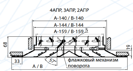 Диффузор 2АПРу 300х300 состоит из прямоугольного корпуса, в который при помощи пружин устанавливается блок из направляющих пластин, оснащен встроенным в корпус регулятором расхода воздуха.