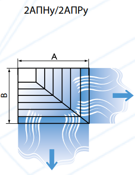 Алюминиевая угловая потолочная решетка 2 АПР-у 300x300 устанавливается на потолке в углах помещений и формирует двухстороннюю настилающуюся струю с углом раскрытия 90°.